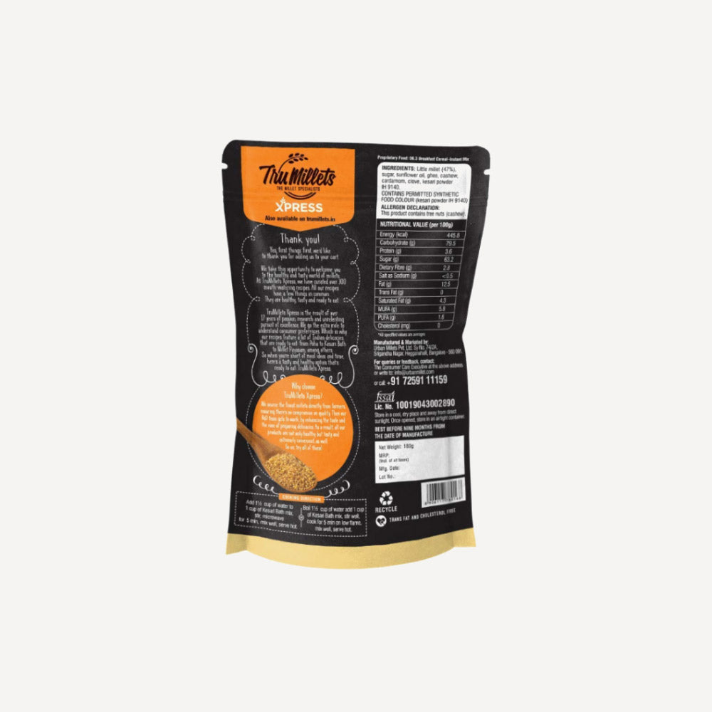 Little millet (47%), sugar, sunflower oil, ghee, cashew, cardamom, clove,carefully sourced from farmers, minimally processed, with no preservatives.