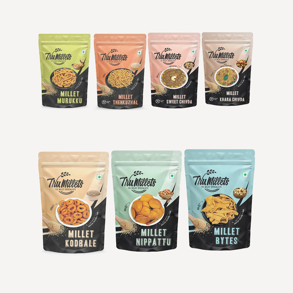 Includes Millet Murukku, Bites, Sweet Chivda, Kara Chivda, Kodbale, Thengol & Nippattu, all made with nutrient-rich millets like Kodo, Foxtail & Little Millet.